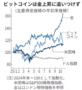 「マネー逆回転のきっかけとされるのは米中対立の再燃だ。トランプ米大統領が10日中国に100%の追加関税をかける方針を公表すると、12万ドル台で推移していたビットコインは10万ドル台半ばまで急落した。金はこの間も最高値の更新を続けており、ビッドコインはディベースメント取引の対象から外れたようにみえる。市場が再認識したのは構造的なもろさだ」